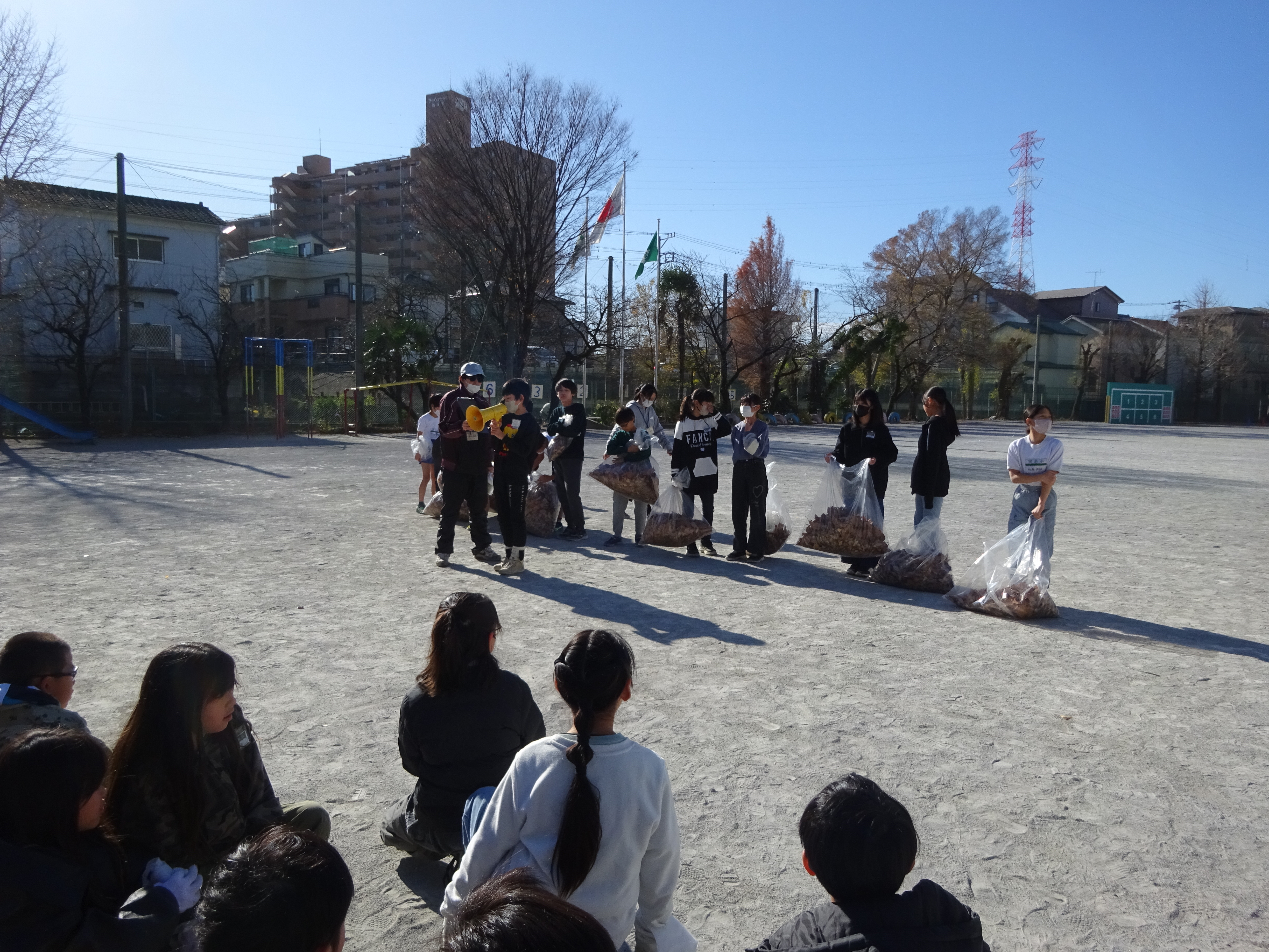 校庭にたくさんの木がある田島小なので、あっという間に数袋分の落ち葉が集まりました。最後は、環境委員さんが大きな袋に集めてくれました。