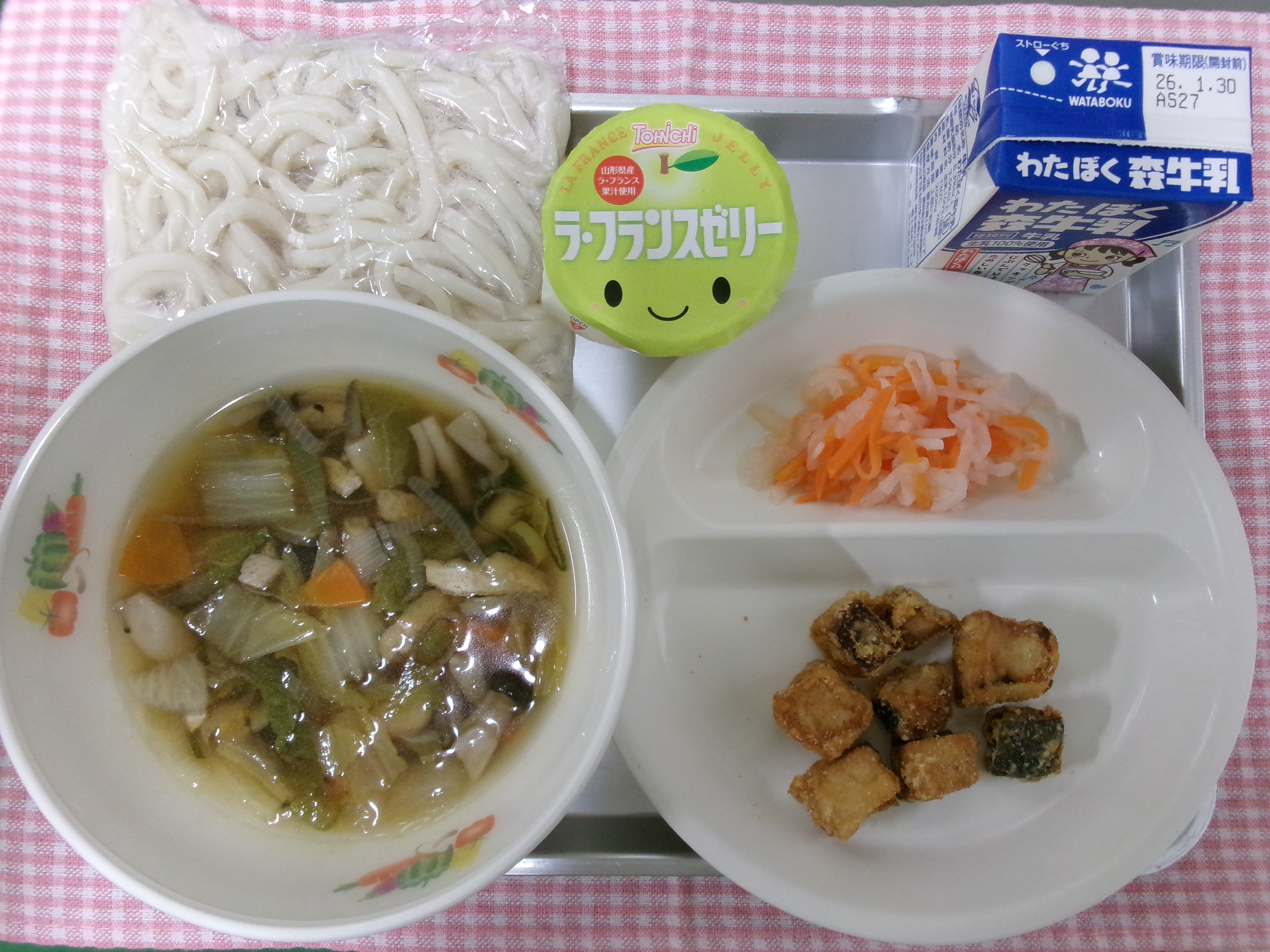 ※6年生が家庭科で栄養バランスや旬の食材、郷土料理等を取り入れながら給食の献立を考えました。今日は6年3組の児童が立てた献立をもとに作った給食です。